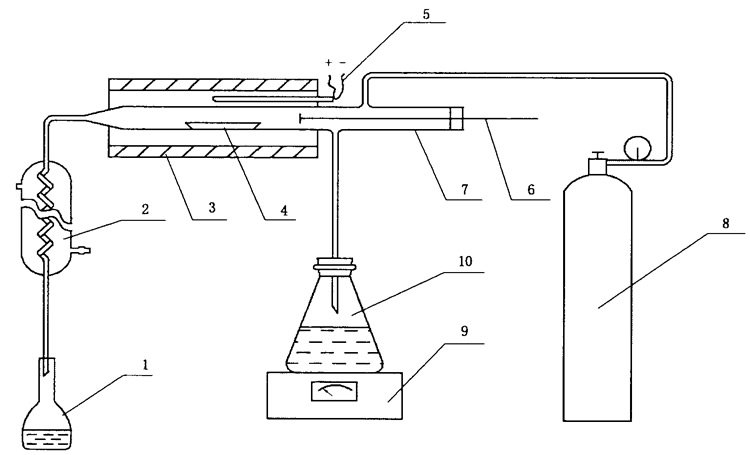 1-容量瓶;2-冷凝管;3-高溫爐;4-瓷舟;5-鉑銠一鉑熱電偶;6-進樣推棒;7-燃燒管;8-氧氣鋼瓶;9-調溫電爐;10 -平底磨口燒瓶。 按圖所示裝配好全套儀器,連接好電路、氣路和水路各個系統(tǒng),將高溫爐升溫到1100℃。往燒瓶中加入約300 mL水并加熱至沸騰,冷凝管通入冷水。塞緊進樣推棒硅膠塞,在平底燒瓶中水沸騰之前通人氧氣,調節(jié)氧氣流量為400 mL/min,檢查系統(tǒng)不漏氣后,通入水蒸氣和氧氣空蒸15 min。 操作試驗步驟 稱取(0.50±0.01)g 一般分析試驗煤樣(稱準至0.1 mg)和0.5 g石英砂放在瓷舟里小心混合均勻,再用約0.5 g石英砂鋪蓋在上面。將100 mL容量瓶放在冷凝管下端接收冷凝液。取下進樣推桿,把瓷舟放入燃燒管內,插入進樣推桿,塞緊硅膠塞。將瓷舟的前端推到預先測好的約300℃區(qū)域停留5 分鐘,接著推進到約600℃區(qū)停留5分鐘,再推進到約900℃區(qū)停留5分鐘,最后把瓷舟推到1100℃的恒溫區(qū),拔出進樣推桿以免融化,樣品在恒溫區(qū)繼續(xù)燃燒分解15分鐘。在整個操作過程中,調節(jié)燒杯內水的蒸發(fā)量,水解開始15分鐘內,容量瓶中每分鐘收集約3mL,后15分鐘,每分鐘收集約2.5 mL,最后總體積應控制在85 mL以內。燃燒-水解完成后,移走容量瓶。停止通氧氣,取下送樣推棒,取出燃燒舟。 測量電位 在100 mL燒杯中加入一定量的水,連接好電位測量裝置,開動攪拌器,更換燒杯中水數(shù)次,直至毫伏計顯示的電位值達到氟電極的空白電位。 在5個用水沖洗過的100 mL容量瓶中,分別加入100 ug/mL的氟標準工作溶液1 mL,3 mL,5mL,7 mL,10 mL,加入3滴溴甲酚綠指示劑,10 mL總離子強度調節(jié)緩沖溶液,用水稀釋到刻度,搖勻,靜置30分鐘。 計算結果: 煤中氟的含量(Fad)按下面公式)計算,測定結果修約到個位。